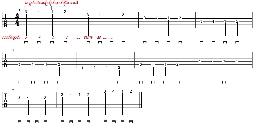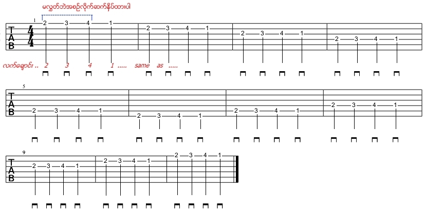 * လက္ေခ်ာင္း ၂၊၃၊၄ ကို အစဥ္လိုက္ မလႊတ္ဘဲဆက္ႏွိပ္၍တီးသြားပါ ။
