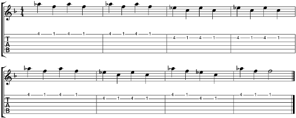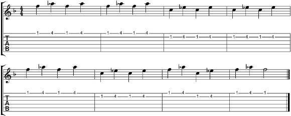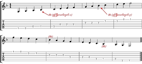 F major scale မွာ one flat ျဖစ္တဲ့ Bbပါဝင္ပါတယ္ ။ ဒါေၾကာင့္ F major key ကိုတီးခတ္တဲ့အခါ ေတြ႔သမွ် B note မ်ားကို flat လုပ္ျပီးတီးေပးရပါမယ္ ။ B ရိုးရိုးကို တီးခ်င္တဲ့အခါ Natural sign ကိုေရးေပးရပါတယ္ ။ ေပးထားတဲ့ Tab မွာၾကည့္ျပီး position ေတြကို ေလ့က်င့္လိုက္ပါ ။