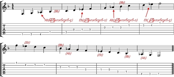 F major scale မွာ one flat ျဖစ္တဲ့ Bbပါဝင္ပါတယ္ ။ ဒါေၾကာင့္ F major key ကိုတီးခတ္တဲ့အခါ ေတြ႔သမွ် B note မ်ားကို flat လုပ္ျပီးတီးေပးရပါမယ္ ။ B ရိုးရိုးကို တီးခ်င္တဲ့အခါ Natural sign ကိုေရးေပးရပါတယ္ ။ ေပးထားတဲ့ Tab မွာၾကည့္ျပီး position ေတြကို ေလ့က်င့္လိုက္ပါ ။
